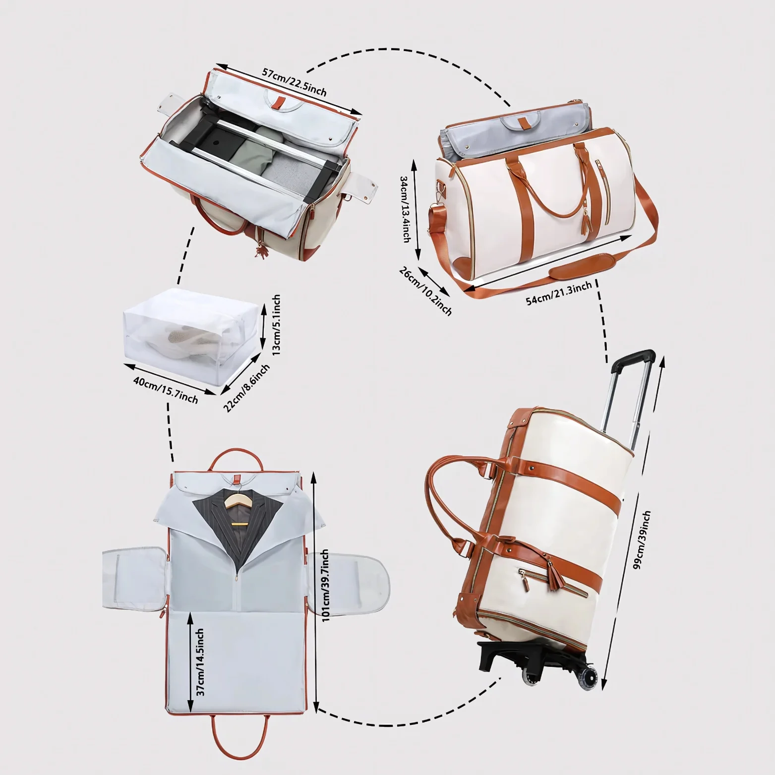 Le sac offre plusieurs options de transport, notamment une bandoulière, des poignées supérieures pour un transport facile ou des roulettes.